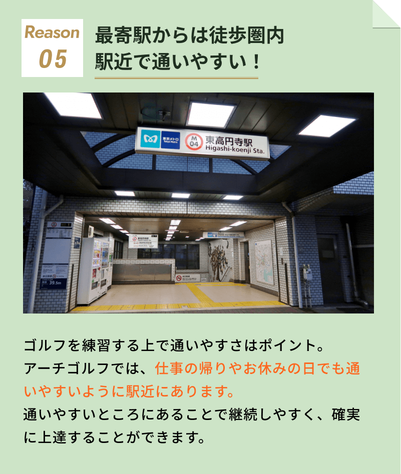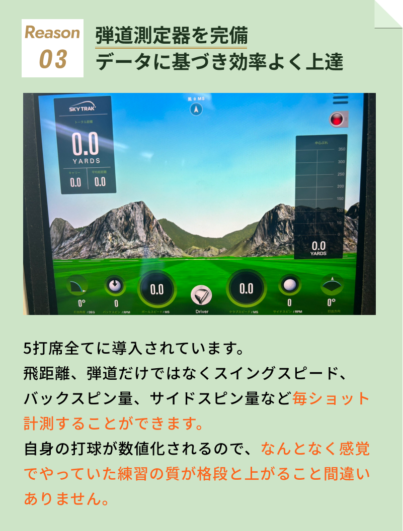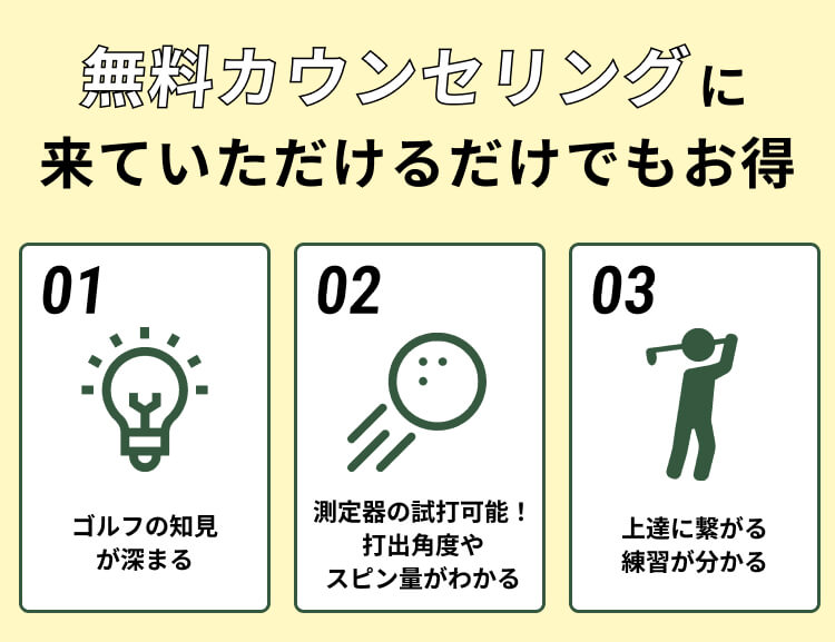 むしろ、広い練習場よりもフォームに集中できるのでスイング美人になるには もってこいです。もちろん、正しいフォームができてきたら広い練習場で打球の行方を実際に確認する練習もよいでしょう。