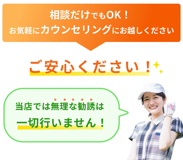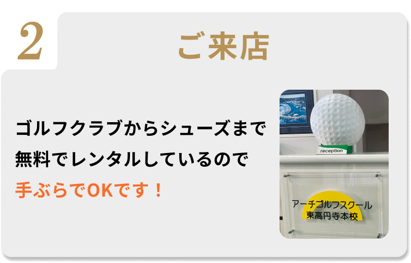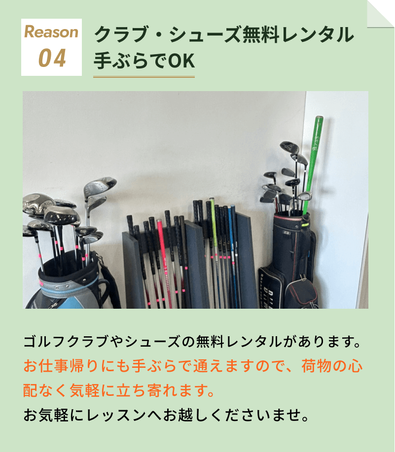 アーチゴルフでは、クラブ、シューズをすべて無料で貸し出して おりますので、安心してお越しください。